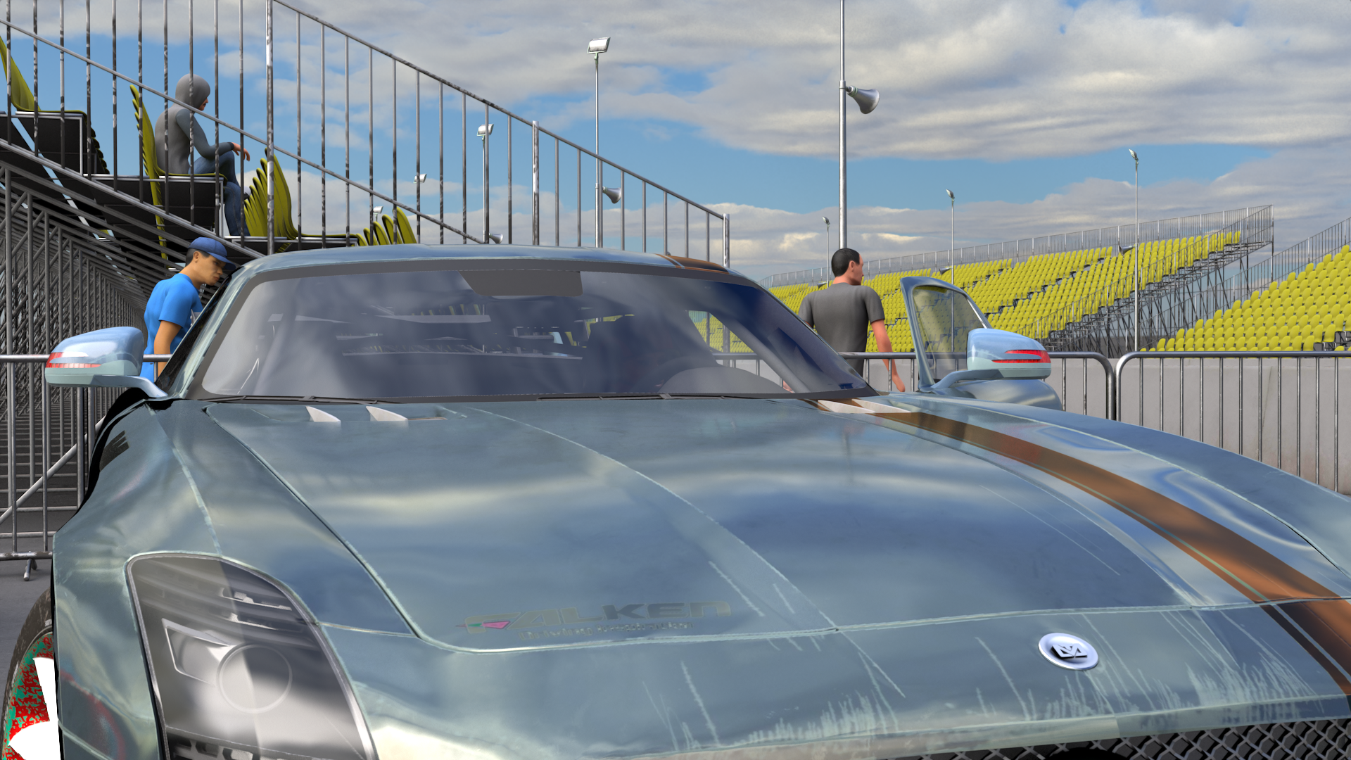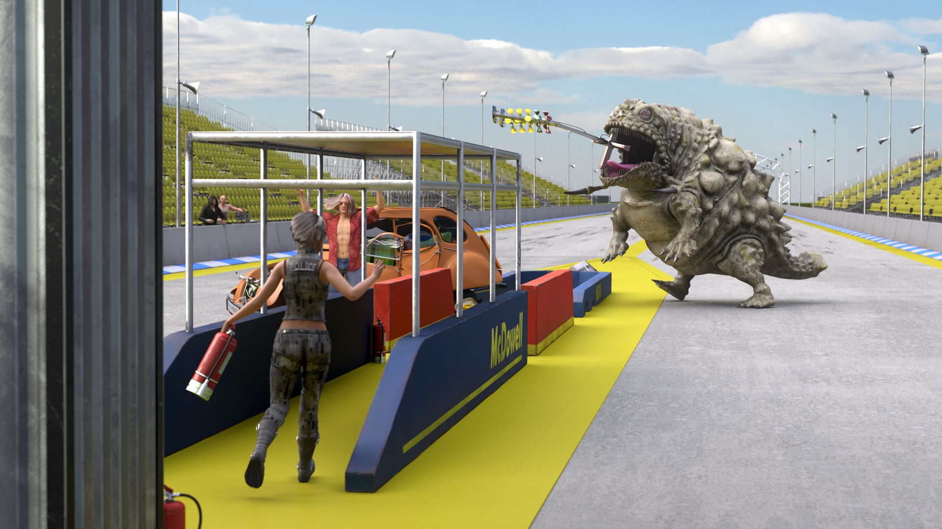 A bunch of renders, basically working on that dragster race track conversion from IRay, there's stuff there using a triple layer shader so a bit tricky;) Also have to try using lo rez figures, so need to develop some diversity...