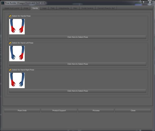 I purchased this on Saturday and, having had a chance to play with it, I can say that it's going to be a very useful tool. Now that the hands/feet issue has been addressed, I do wish that there was a way to adjust the head/neck positions without actually leaving Pose Builder, as I tend to follow the old school rule of matching the tilt of the hips and head as much as possible. Another nitpick is that one has to do a bit of a dance when working with inverted poses, ie: where the character is hanging upside down. If the pose being used for the top half is from an inverted pose there's no problem, but if the only the pose set being used for the bottom is from an inverted pose, the combined pose will automatically follow the top half. I imagine the need for a vertical mirror function isn't going to be all that common for most folks, but it's something to keep in mind for future upgrades/add-ons Finally, I've come across a few cases where Pose Builder was simply unable to find a .duf file from the .png. However, I've found that usually just changing the .png to .duf will let Pose Builder find the pose, though it leaves the thumbnail blank. Very odd.
