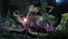 I really like the angle of the camera, tilted up from a lower position, I love the crispness of the scene and the posing of the serpent. It's a very dynamic scene and obviously well thought out. Doing a forest render is always tricky and you do have to take some liberties with lighting to show expressions, so take what I've said with a grain of salt. :)