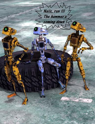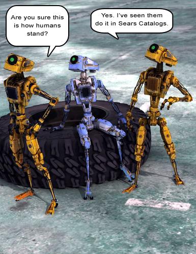 "Excuse me. We asked about robot retirement, not re-tire-ment!"