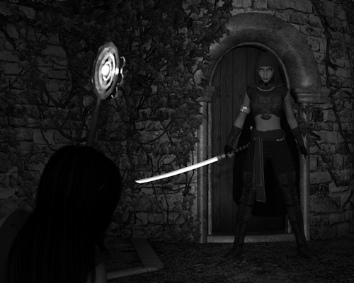 Nice work...I like how the staff turned out. I do think your focal character could use a little more illumination, especially considering how the illuminated staff draws the viewer's eye away from her. Otherwise I find the lighting in your scene very effective.