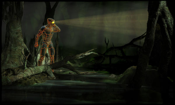 I added the dark edges in postwork, with a Filter Forge effect. I like to use it with most of my renders, as it's not that obvious, but still something which binds the render together. I guess I could play with a Saturation/Brightness mask, but the contrast in this render is supposed to come from techy suit vs swamp, and warm/orange color vs greenish swampy color.