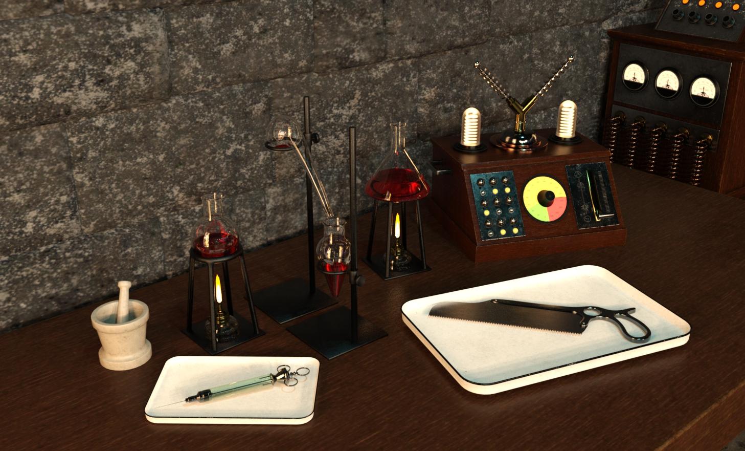 Another machine, and some more props. The retort stands are fully adustable, so you can make your own chemistry experiments, or cook up your zombie animating serum. Adjust the height of the flames in the alcohol lamps. The syringe is easily operated, and comes with a parented liquid core (not shown here) that scales from the base of the syringe, so you can fill the syringe as much as you like, and make the fluid volume diminish as you press the plunger, if you're animating. Oh look, there's the mortar and pestle again...