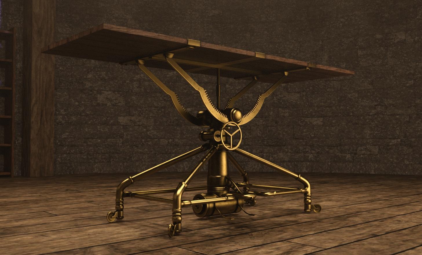 Right now, you've got two pieces intended for the center of the "operating theater", this operating table (modelled after a real Victorian-era brass operating table). It's fully rigged of course, tilt the table top, turn the wheels, press the foot pedals. There will be a foot rest and arm restraints as well...mua ha ha ha...