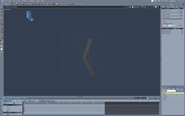 I'd like to use Carrara 8.5 Pro physics to simulate kinetic sculptures before I build them. However, I can't seem to get even the simplest linkage to simulate correctly. Please take a look at the very simplified linkage photos attached and tell me what I'm doing wrong. It consists of two linkages, one grounded but free to rotate and the other attached to the first. I've moved the hot points to where the pivots should be, and applied a shaft constraint, but as soon as I hit the Physics button, the linkages go every which way, not even close to what would happen in real life.