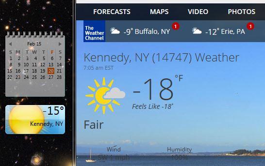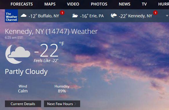 Actually, the computer temperature is measured somewhere near here, probably at the Jamestown airport about 10 miles away. The thermometer on my porch says -20F and it gets hit by exhaust from the furnace only about 12 feet away. So draw your own conclusions.