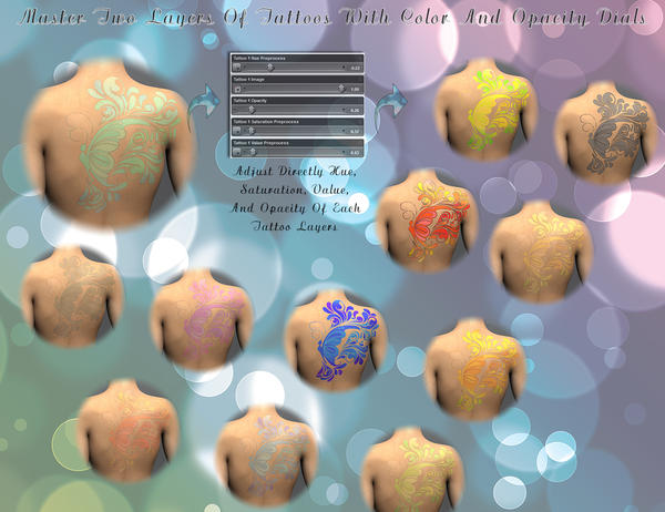 - Add two independent layers of tattoos and adjust their colors and opacity.