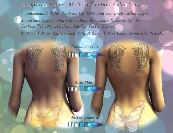 - can be loaded on each layer independently, and in order to use more different pattern of tattoos on a same layer, their LIE version is also included (which remains faster than general LIE on diffuse maps due to the nature of maps).
