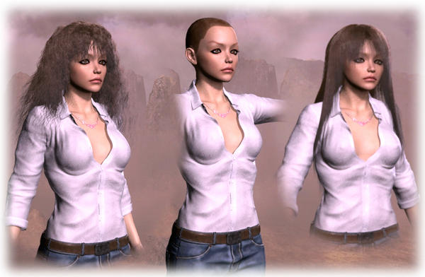 I know that a nine minute animation is too long for a quick simulation test, and I should have given in to my knowing better. I saw that the guide hairs where doing their thing in the simulation, and the hair appeared to be moving okay during the scrub-through, but the hair was not animated at all in the actual render. I'm not sure if it was due to the kink shader? Not sure of anything right now, so I'm rendering it now without the kink shader. Tomorrow I'll make more appropriate tests, as Jonstark suggests! LOL ...and I'll also post some videos. Here's an image of how far I've got. The center is the fitted V4 hair cap, which I've now decided that I won't need. The left is with the kink, and the right is without. The one on the right looks a lot like how she looks when she straightens her hair anyways, so I might just tweak that one a bit and use that if the kink gives me too much trouble. I have a feeling that it's not the kink, though, and that I'm just missing something simple. We'll see.