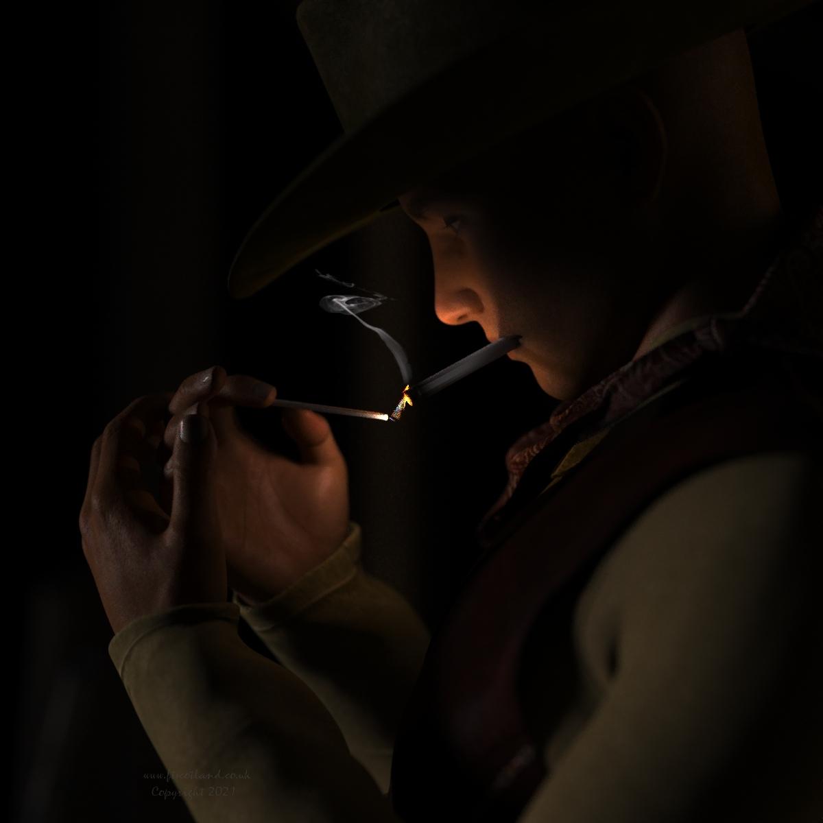 This one is outside with Environment set at Midnight on the 21st December in the Northern Hemisphere, so dark, with a Spotlight in front and the flame for the match set to Emissive at 6 Lumen. I also set up the DOF on it.