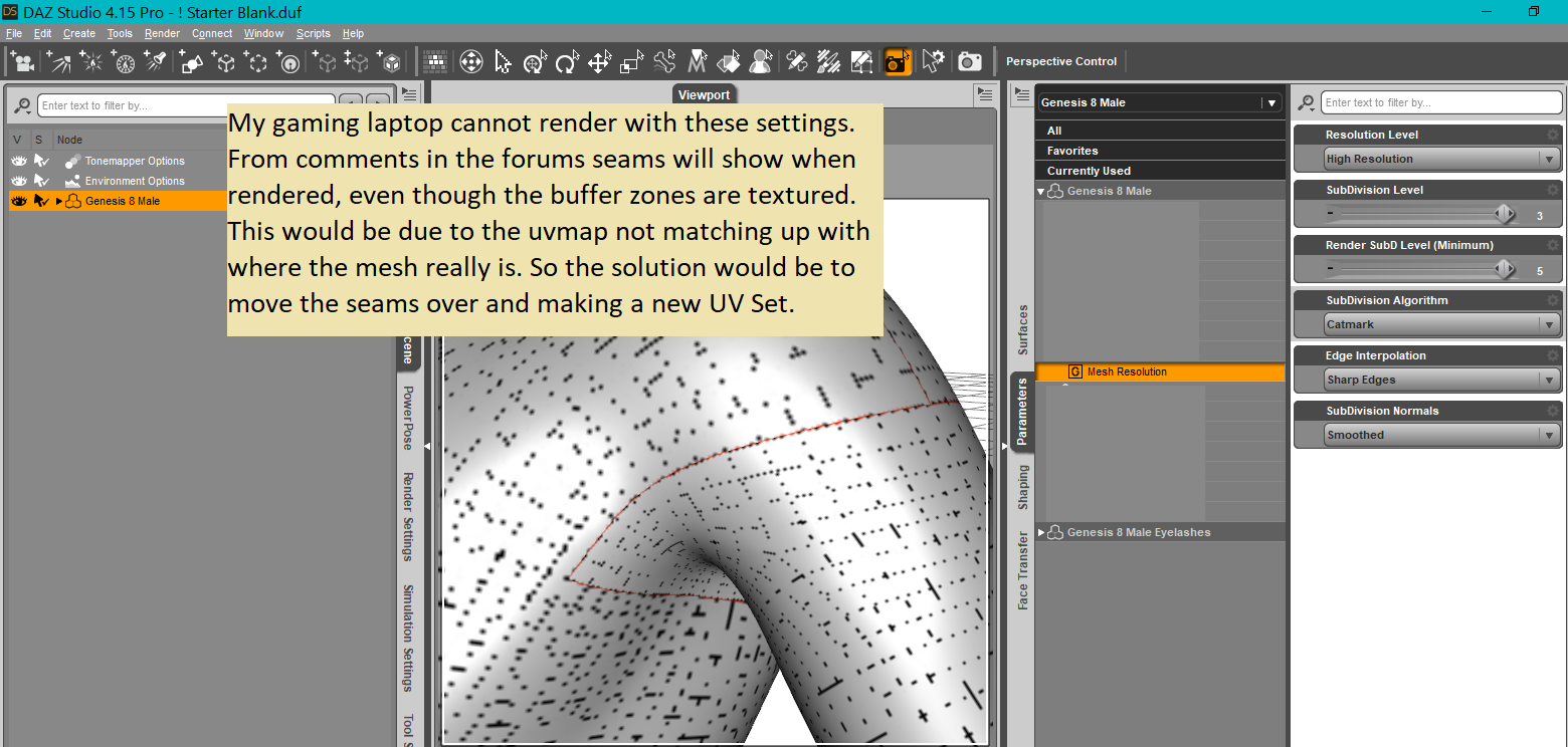 SO possibly that could be "solved" with a new uvset with "as little change as possible" to all areas except the seams. Such would of course NOT be redistributable so yes, technically I could put together a tutorial on the topic BUT I cannot actually make the rendered images for before and after work is done because my little ol' gaming laptop crashes D/S if the figure is subDivided too much.