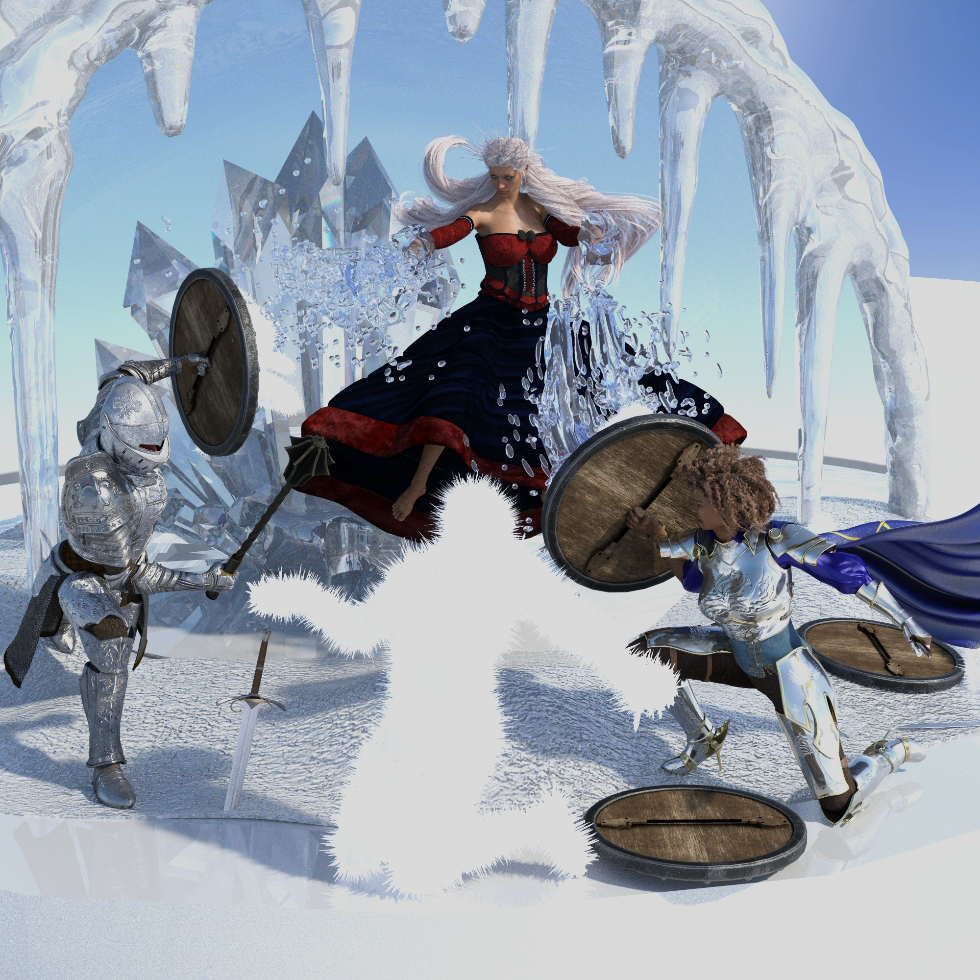 I'ld also do some lighting adjustments. Maybe making the zpped middle character glow some that would illuminate those around it from the center more. Maybe darkening the sky to give more shadows for contrast and putting a light behind the ice crystals could make this much more dramatic.
