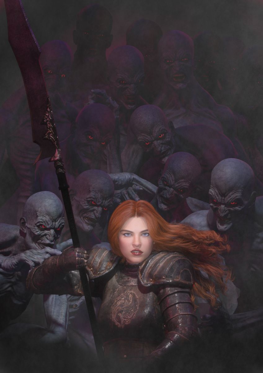 I'ld also probably move the shiled on the far right a bit so it doesn't give the appearance that the woman paladin is holding onto it, the dep of field is shallow so at first I thought she was holding 2 shields.
