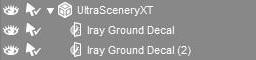 Decals must be parented to the object that you want them to show up on. For example, parent the decal to the UltraSceneryXT object. The decal must encompass at least part of the parent's geometry. The decal cannot float entirely above the parent object or completely off to the side, etc. The decal is just shown in textured viewport as bounding box corners, so sometimes it is hard to position.