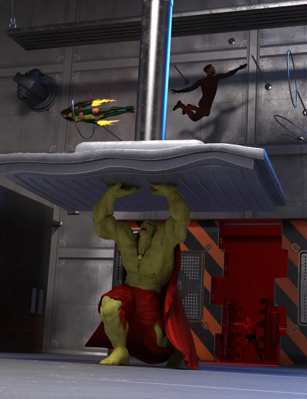 The Superhero Training Room comes with numerous props and figures to be arranged as you like, making this set modular. Two preloads are included for full rooms as examples in 2 different texture flavors, making a total of 4 preloads. Individual items include 2 hydraulic presses — 1 vertical and 1 horizontal (The horizontal one is designed to be used in pairs. Rotate one base 180-degrees in the Z-axis to fit the teeth together.), a rotating hoop to fly through/swing off, a pole to swing from and balance on, a step to step up, a wall to block off a path, a moving target to shoot, a turntable and turrets with a projectile, a floor block to be raised and lowered, and a walkway. The hoop, pole, step, and wall are rigged with a base to appear to extend out from the room's floor/walls (see promos). Numerous movement and damage morphs are also included (see promos).