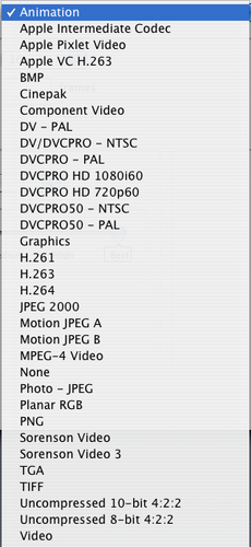 The following is a screen shot of the codecs available to me, yours may vary somewhat. h.264 has good quality and lower file size. Plus it's a Youtube friendly format. The other screen shot is a simple compressor setting available with many of the codecs. You'll want to slide the slider all the way to the right for maximum quality. The empty box on the right would display a thumbnail image from the video if I had one selected. Some of the compressor settings can be a little more involved depending on the Codec. For instance DVD codecs will usually give you options on if you want a one pass or two pass encoding, etc.