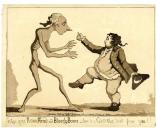 Pitt, a naked spectral creature, advances menacingly towards Fox, who is scarcely caricatured, and who holds his ground, right leg raised as if about to kick, snapping his fingers in Pitt's face. Pitt (left) is very thin and tall, with large head and glaring eyeballs. Fox holds out his three-cornered hat in his left hand as if speaking in the House of Commons;…