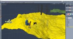 Simple scene setup using a G2F and the millenium dog. The terrain was created using the Carrara terrain modeler with a plateau fliter to create the path. The current shader uses a layer list simply to divide the terrain shader into three parts - below the path, the path itself, and above the path. I use the 'local' setting in the elevation blender when manipulating a single terrain like this. Wether you use local or global, make sure it is the same for each layer blender.