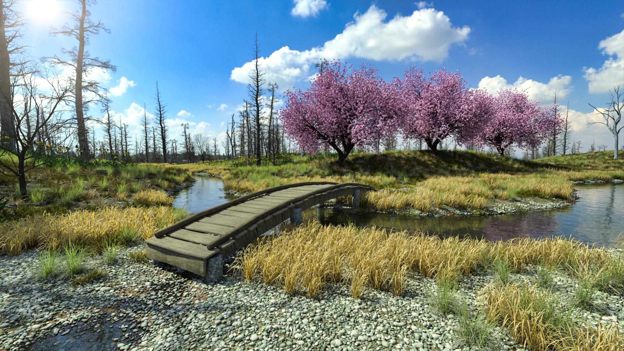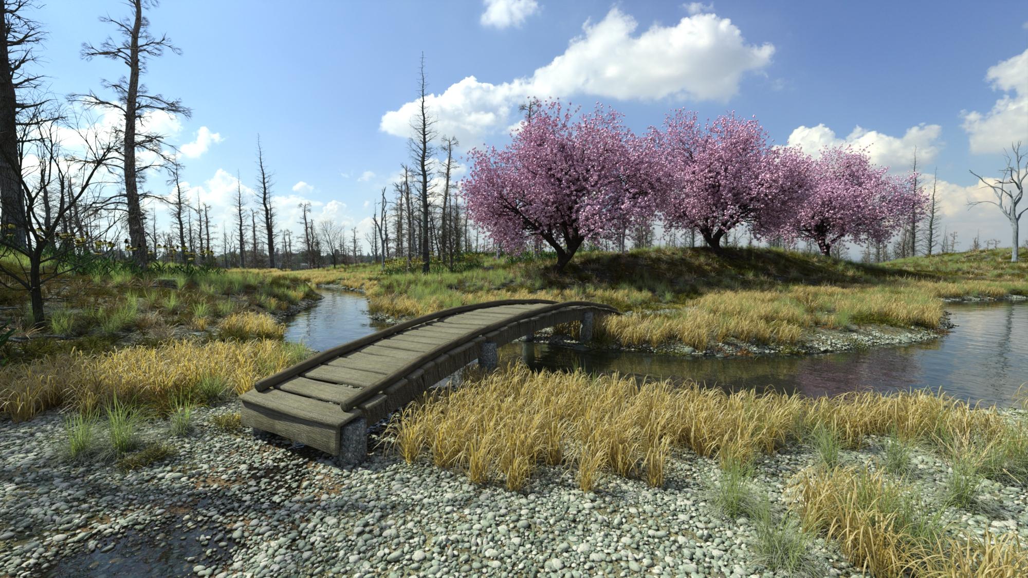 Here is another one. I used the Height Map Generator to generate the initial terrain and Mask Builder with couple markers to add a height map in the middle to make the little ridge. I used HedgeMaker to place the three Sakura trees on the ridge. I used Mask Builder to keep the rest of the trees away from the Sakuras. I played around with a few shaders on the bridge for fun.