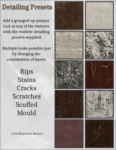 Hi everyone, my latest shader pack for DAZ Studio has been released. It consists of 53 seamless texture presets which include patterned and plain textures that have an aged look, and wood surface textures. These can be used as they are, but also included are a bunch of presets which allow you to take a texture and really grunge it up - you can create cracks, mould, scratches, rips, stains, and scuffed grunge details using the plain texture presets to create the colour detail of those effects. The grunge detailing can be tiled separately from the main texture, which is great to customize how you want the detail and textures to look.