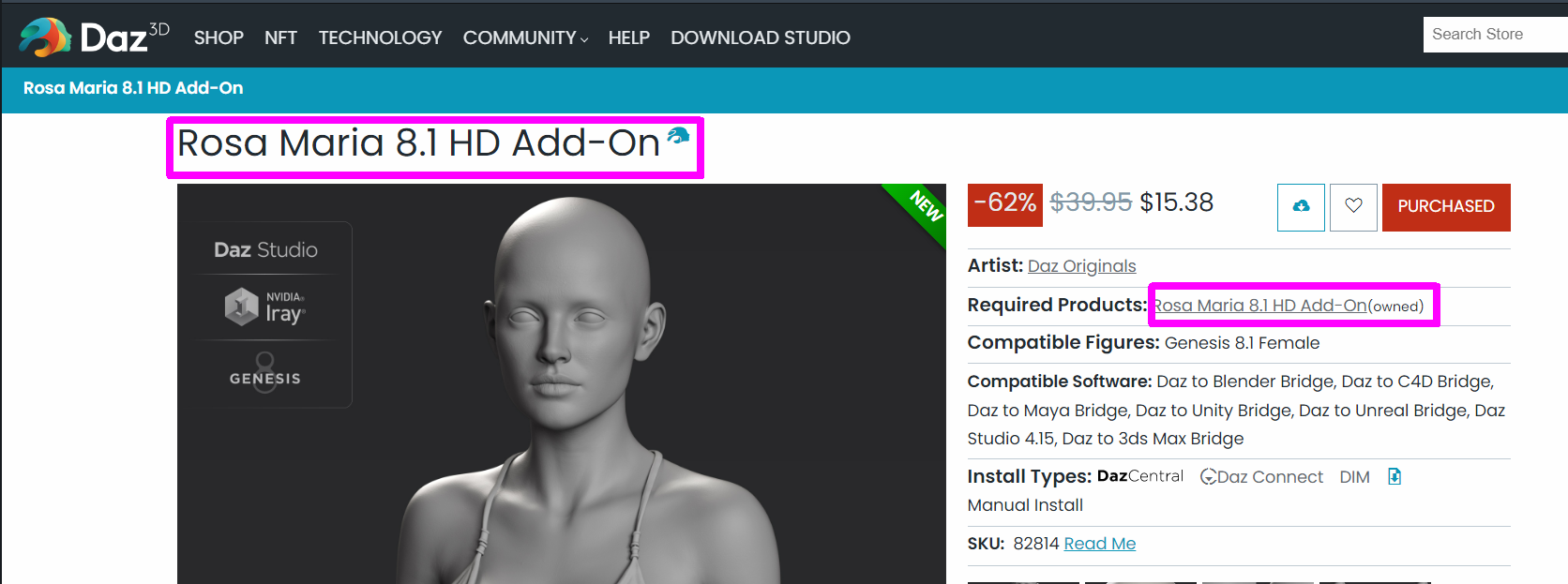 There's an issue with the Required Items for the Rosa Maria HD Add-on. It lists itself as the required item, rather than Rosa Maria's non-HD version. If you click the link, you wind up back on the HD addon page, so the link needs to be corrected.
