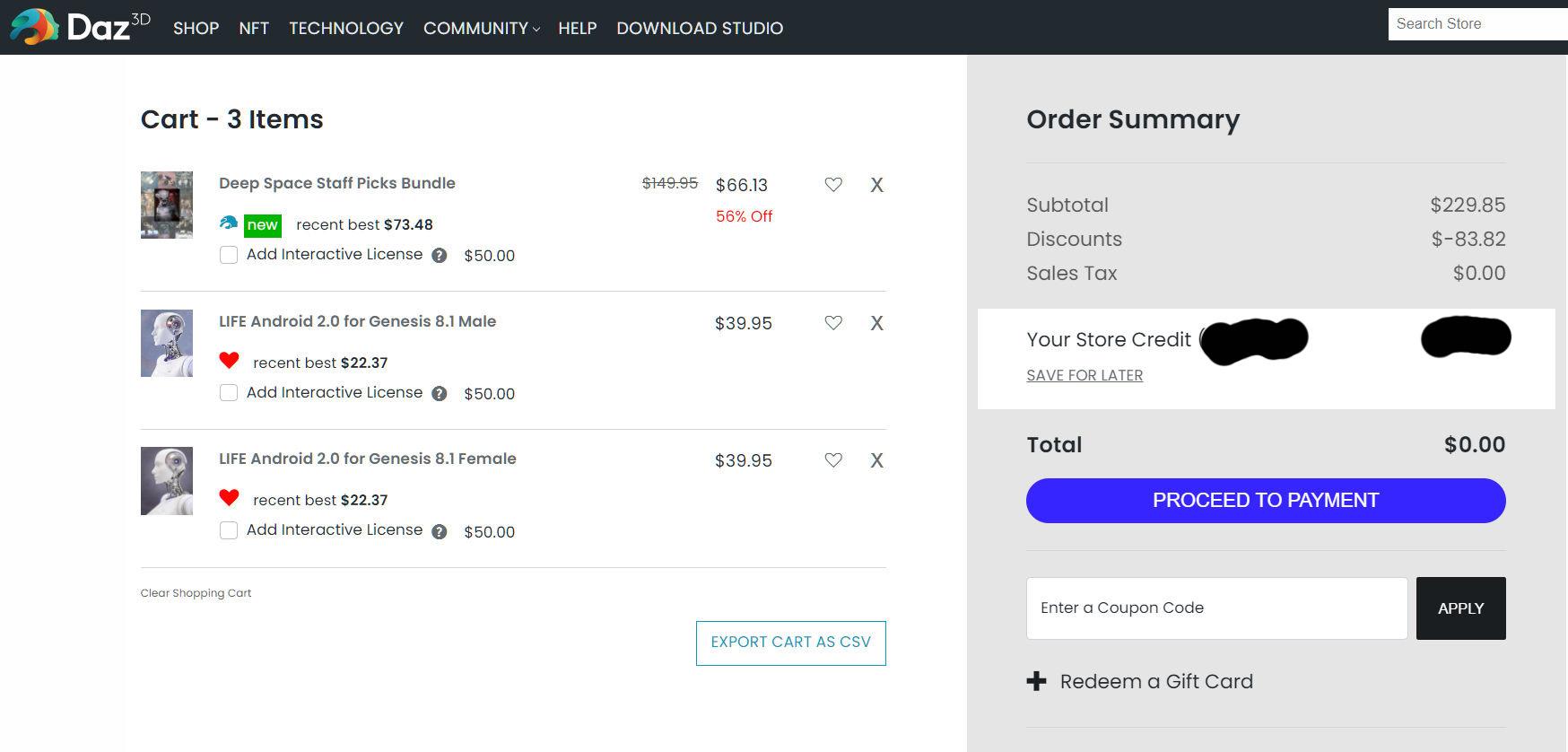 The Daz coupon is also not playing well with today's offers. I have the bundle with three 13$ off items in my cart and the coupon is only knocking off aroun $4.80 instead of $6. I don't really care, just letting you know.