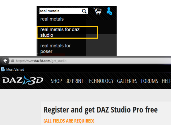 I came across some store search weirdness today. I was searching for Real Metals for DAZ studio in the front page search box. When you click on the auto filled text link it doesn't bring you to the product page, Instead it dumps you to 'get studio/ registration' page for new accounts.