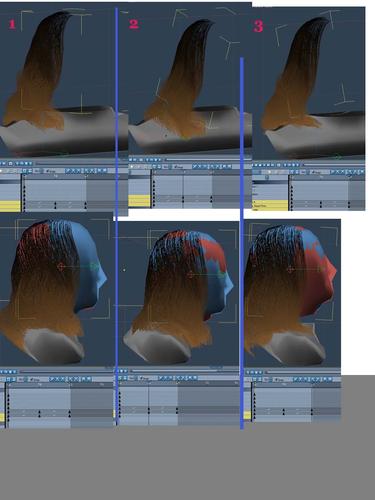 Some of the experiments I am doing at present is to make hair sections and render them out of Carrara individually. Then in After Effects , stacking them up and distorting the different hair group layers using Bezier Warp. Then of course render out the whole comp. I am still playing around with other AE filters - so there may be a better solution in the wings. This of course brings its own problems, such as lacking appropriate shadows, etc. More tweaking... But it is a work around. It would be so much easier if Carrara would allow the key framing of the hair groups.