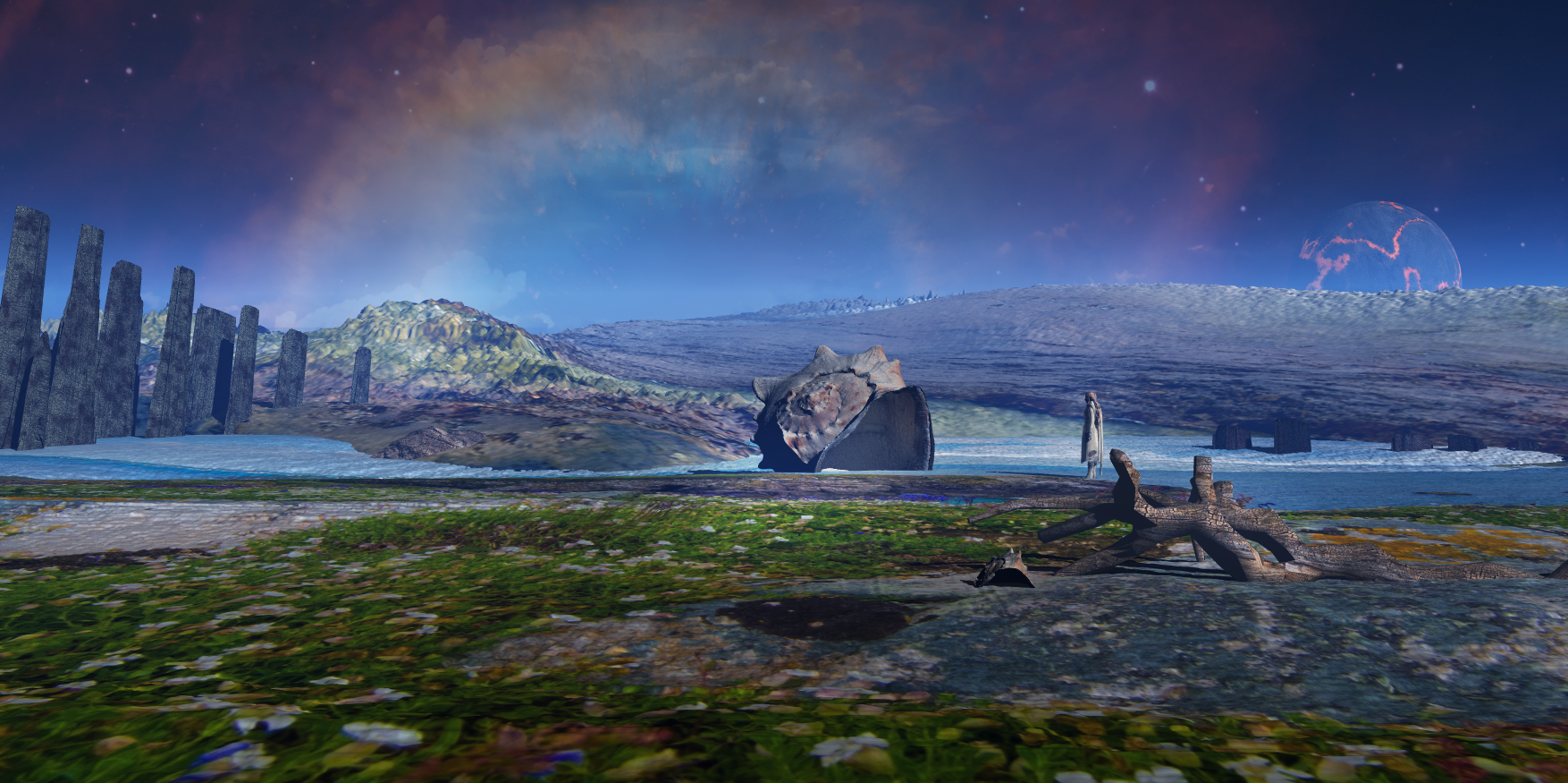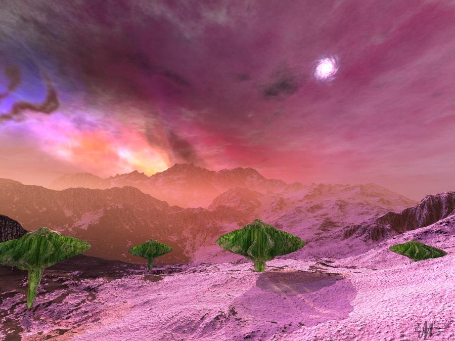 The terrain and materials from the Grand Mountains, the sky from Landscapes under Fantastic Skies, the galaxy from Space Construction Kit and the alien flowers were done in Wings 3D or a freebie, I'm not sure.