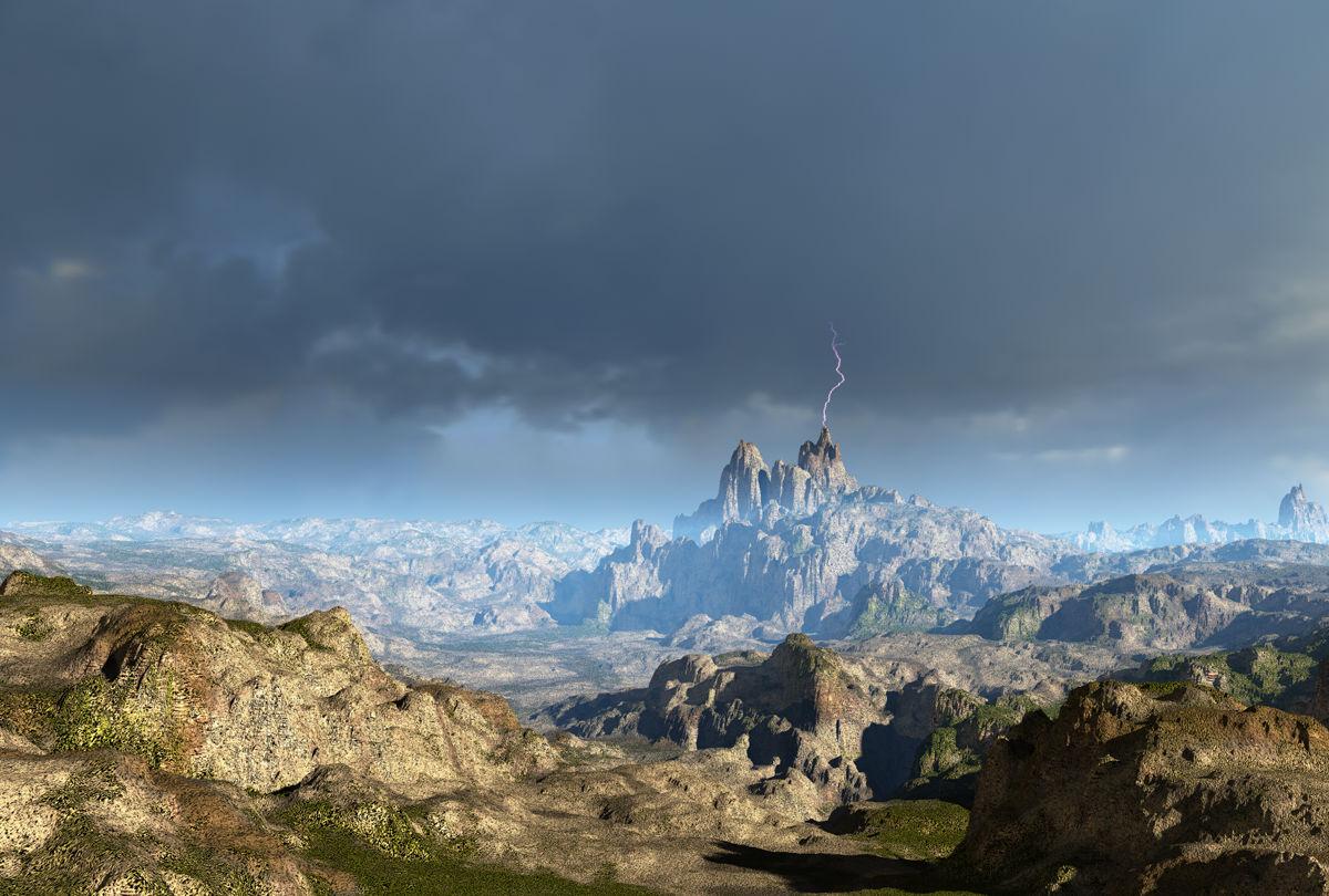 Not exactly fitting for the Peaceful challenge. An inverted self made terrain with a material from High Resolution Terrains 1 and a sky from the Sunless HDRI Skies set. The lightning flash is a photograph I took some years ago on a 2D-Face.