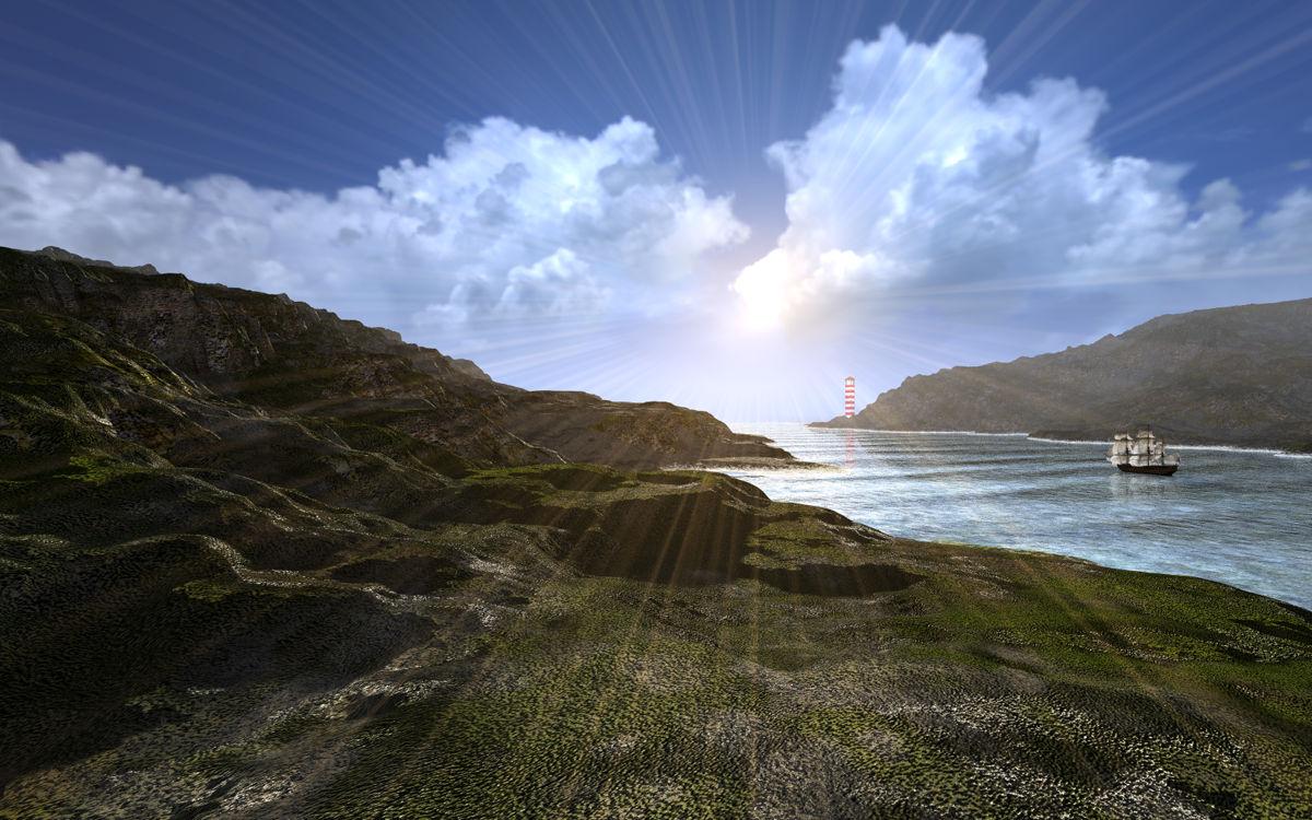 Double stacked terrain and materials from the from the High Resolution Terrains sets. The sail ship is the HMS Victory, the sun rays from Environments - Inclement Weather; sky and ambient light by the ErmClouds07_SD HDRI from Gritstone Hills and the key light by the sun. The beacon tower is self made.