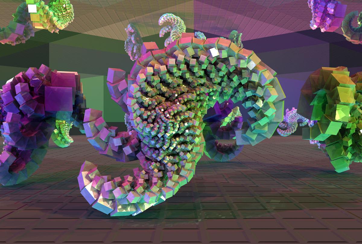 Fun with 3D. The same object (two) as above within a mostly transparent cylinder. Light and colour by the WhiteSphere HDRI, some light and specular by the sun.