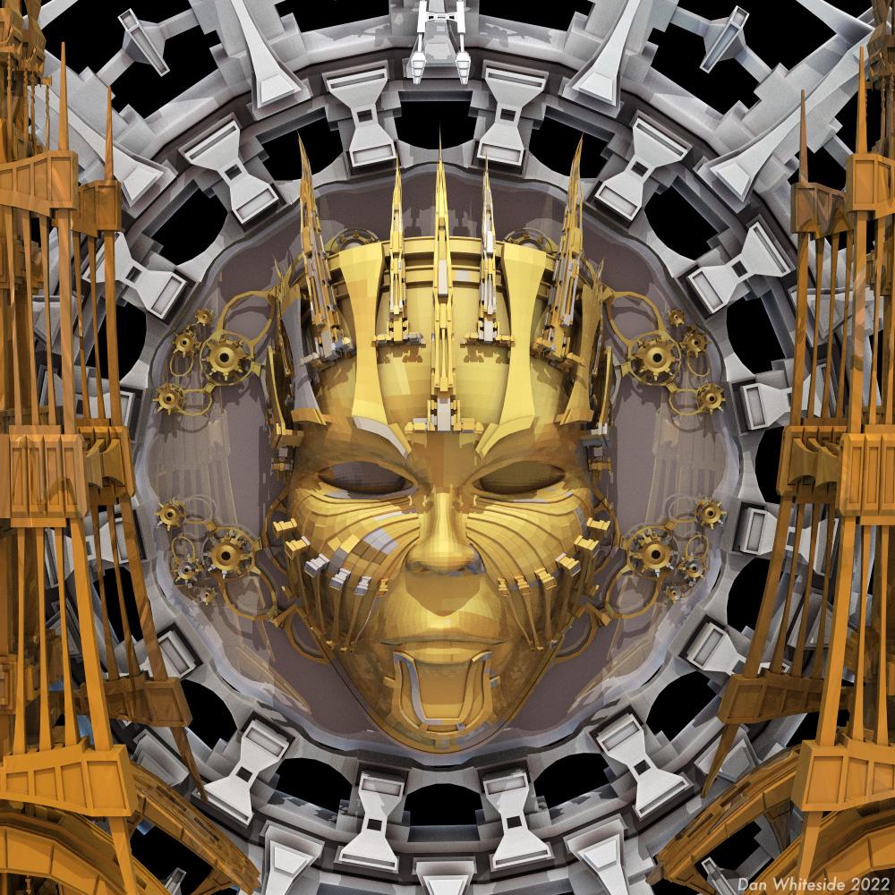 An image created with the Mechina model set by Poisen. The various parts were assembled in Modo and exported to Bryce. Most of the  textures are Bryce procedurals except the "ring" which uses the original Image texture. Illuminated by a single spotlight and use sky IBL. Rendered at 32 RPP, TA enabled - about 4 1/2 hours.