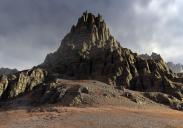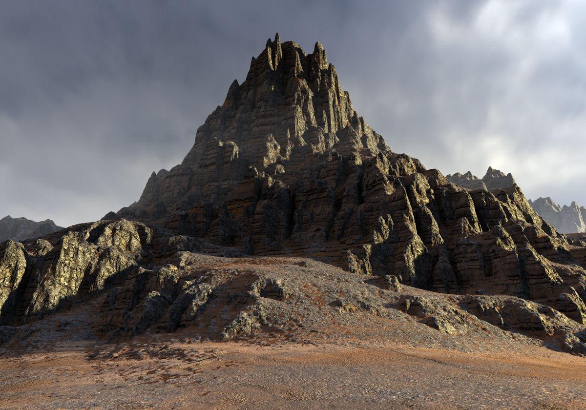 Double stacked terrain with materials from High Resolution Terrain sets. Sky and ambient light by an HDRI and the key light by the sun. A high crag with geological rock stratum.
