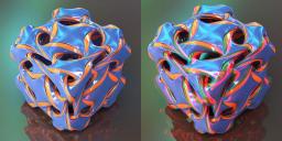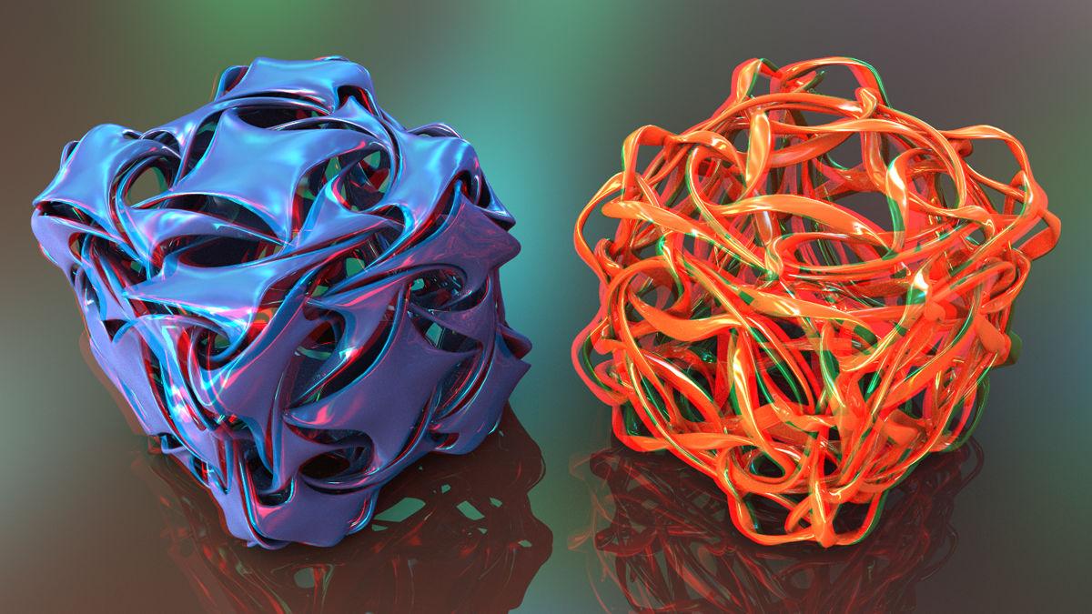 The objects were made in Wings3D, the right one is reversed. Simple colours, rendered with the Obscure Light method (Memo and link to video on my website: 3D CG Documents > Memos > Lighting > Obscure Light). The right object is the one used above with the shadows.