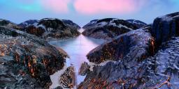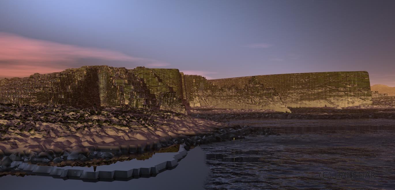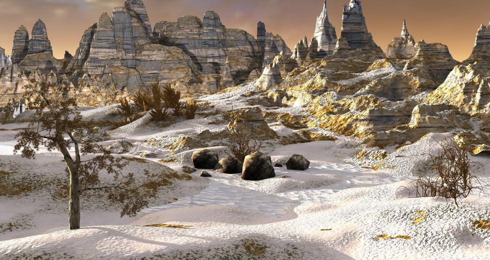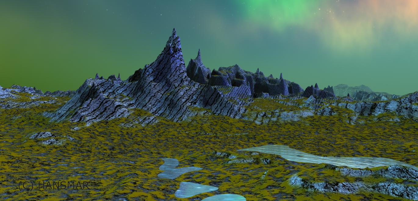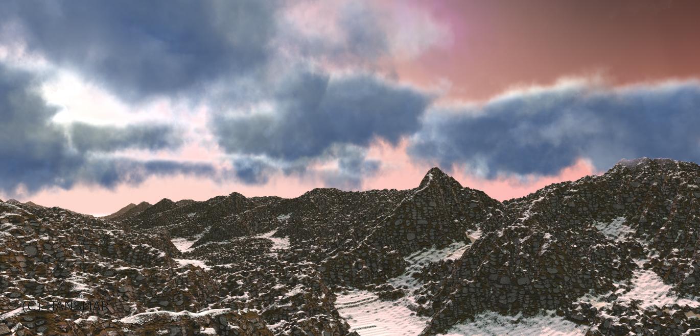 Hansmar, the first three are my favorites. The first with the rocky material has a wonderful sky and the snow settling in the lower parts..perfect. The second second has the most unique material on the terrain, very cool. The third is a sequel to your other dino image. The terrain looks like it came out of the Jurassic period.