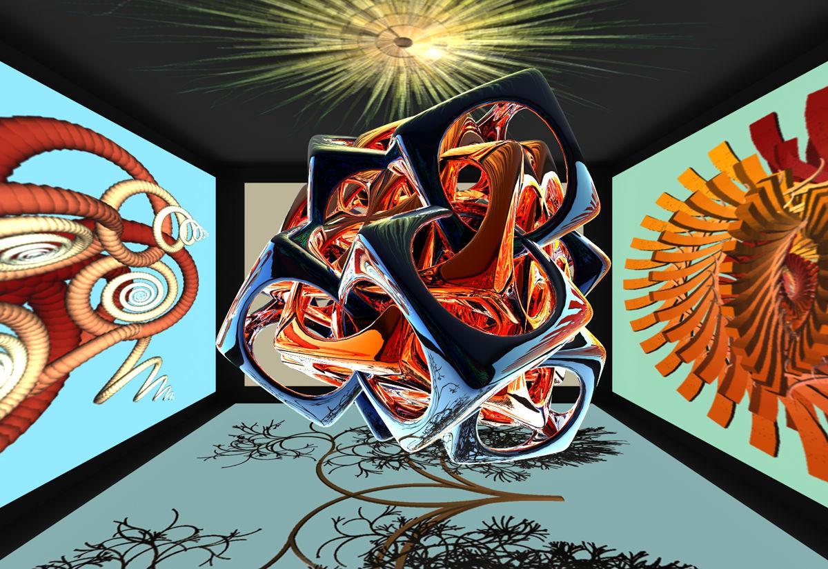 The object was made in Wings3D and given materials from Fifty Funky Shapes & Fifty Funky Metals and is within a cube. Lighting after the "Hypertexture Obscure Light for Indoors" (PDF on my website under Documents - Mine - Light) method with 6 flat Parallel Lights; in front of them 2D-Faces with images from renders made with Structure Synth objects. Rendered with True Ambience.