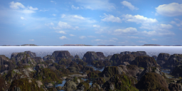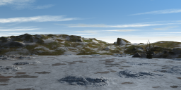 The next set is a set of reworked terrains from the one that started with a photo of leaves (and berries) that I used quite some time ago. I did quite some modifications, e.g. add a picture in the terrain editor and blend it with the original height map. Various sky textures, including HDRI, one from the fantastic skies and the other two from the sky itself. Also different terrain textures.