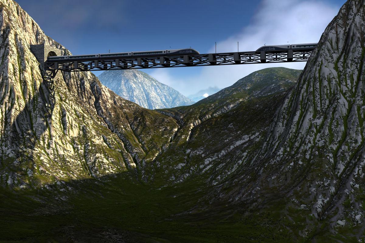 The terrain was self made and given a material from Terrain Stacking, and a tunnel opening with a light inside. The bridge consists of parts modelled in Wings3D by David Brinnen, and the eurolink trains are from the Google 3D Warehouse. Sky and ambient light by an HDRI and the key light by the sun.