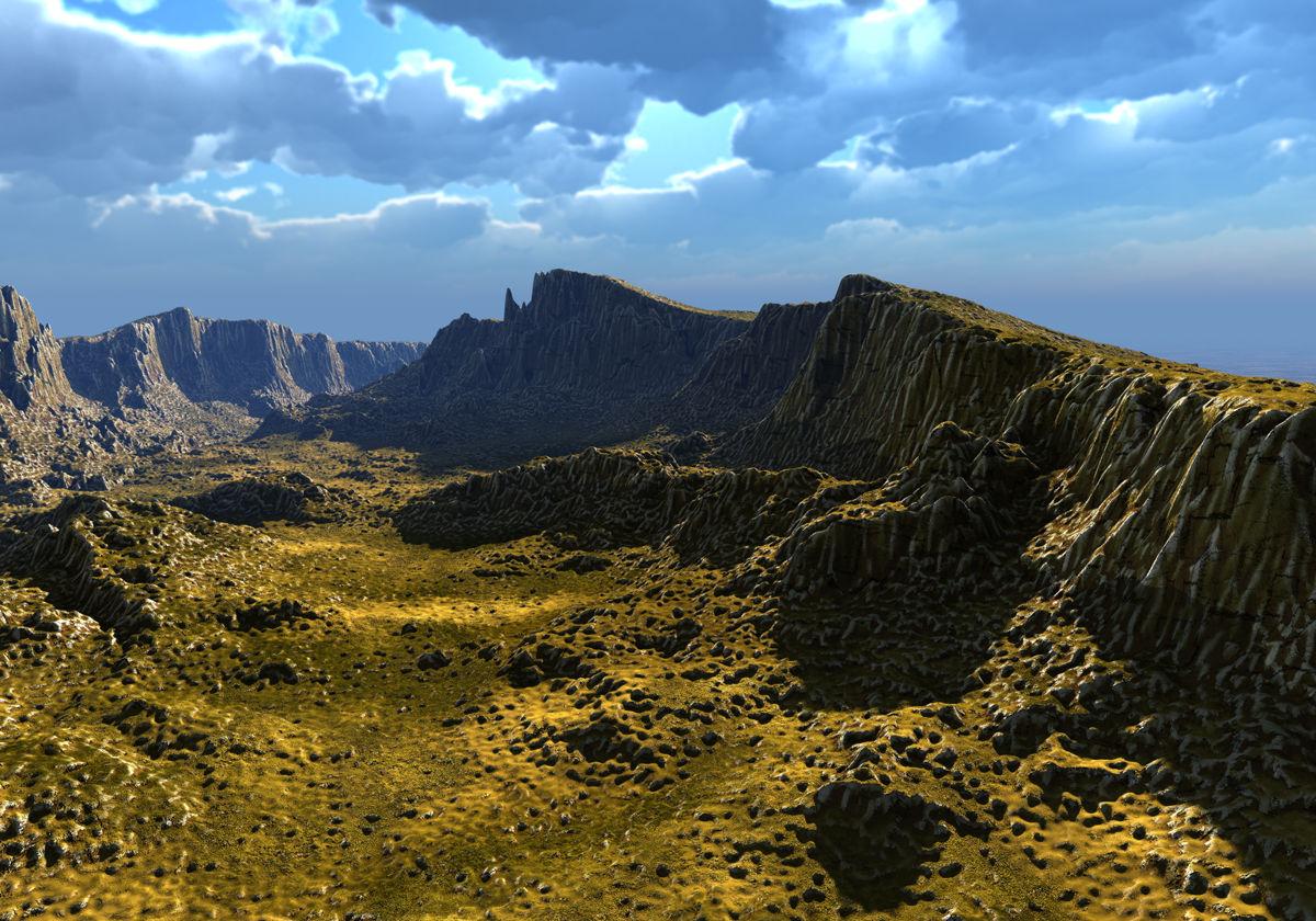 The terrain was generated from a cloud photograph and given a material from Gritstone Hills. Sky and ambient light by an HDRI from HDRI Captured Volumetric Skies, the key light by the sun.