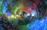 Two Bucky spheres (Geodesic Domes after Bukminster Fuller), one behind the other, made in Wings 3D by David Brinnen, within a drawn-out sphere with reflection and transparency. An HDRI within the Bucky spheres casts shadows onto the surrounding sphere and the colours from outside shine into the elongated sphere with the camera.