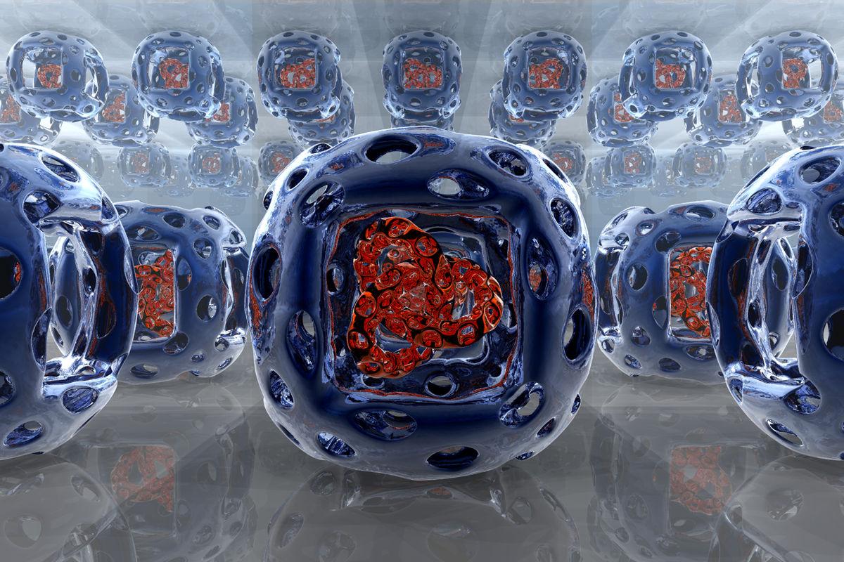 Two in Wings3D made objects (TressRoundOpen and ChainLinkTorus) with materials from Fifty Funky Shapes & Fifty Funky Metals are together with the camera within a elongated cube with some transparency and reflection. Illuminated by the WhiteSphereB7 HDRI.