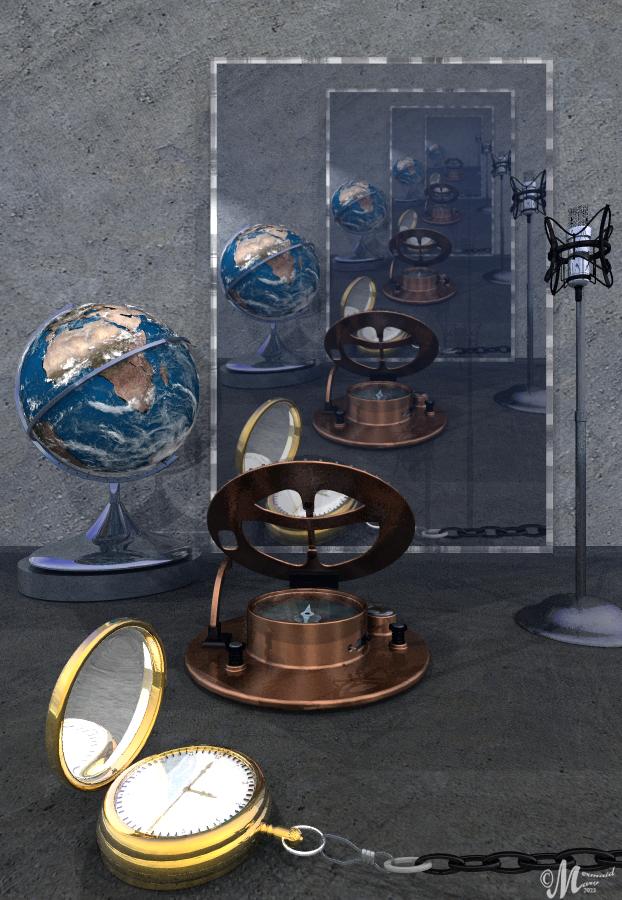 Hubism_2023-02-24__sample-gsuffa_Hansmar2: sphere less elongated. Maximum depths rays to 9, camera 90 degrees, rotated and closer to the items. Camera moved to the side too (so the left is just reflections); Big sphere reflecting clouds texture.