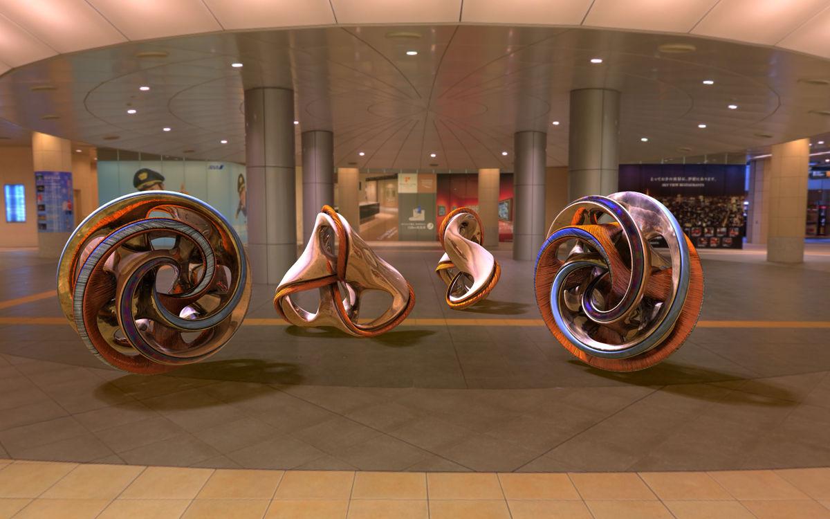 The object is from Steven Ray with four materials from Fifty Funky Shapes & Fifty Funky Metals. Backdrop and ambient light by an HDRI from HDRI 4 Fun, additional light and specular by the sun.