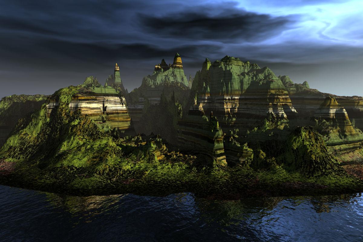 Horo : The funky shapes are beautiful and shiny, great background.. The terrain has a natural look, love the sky.
