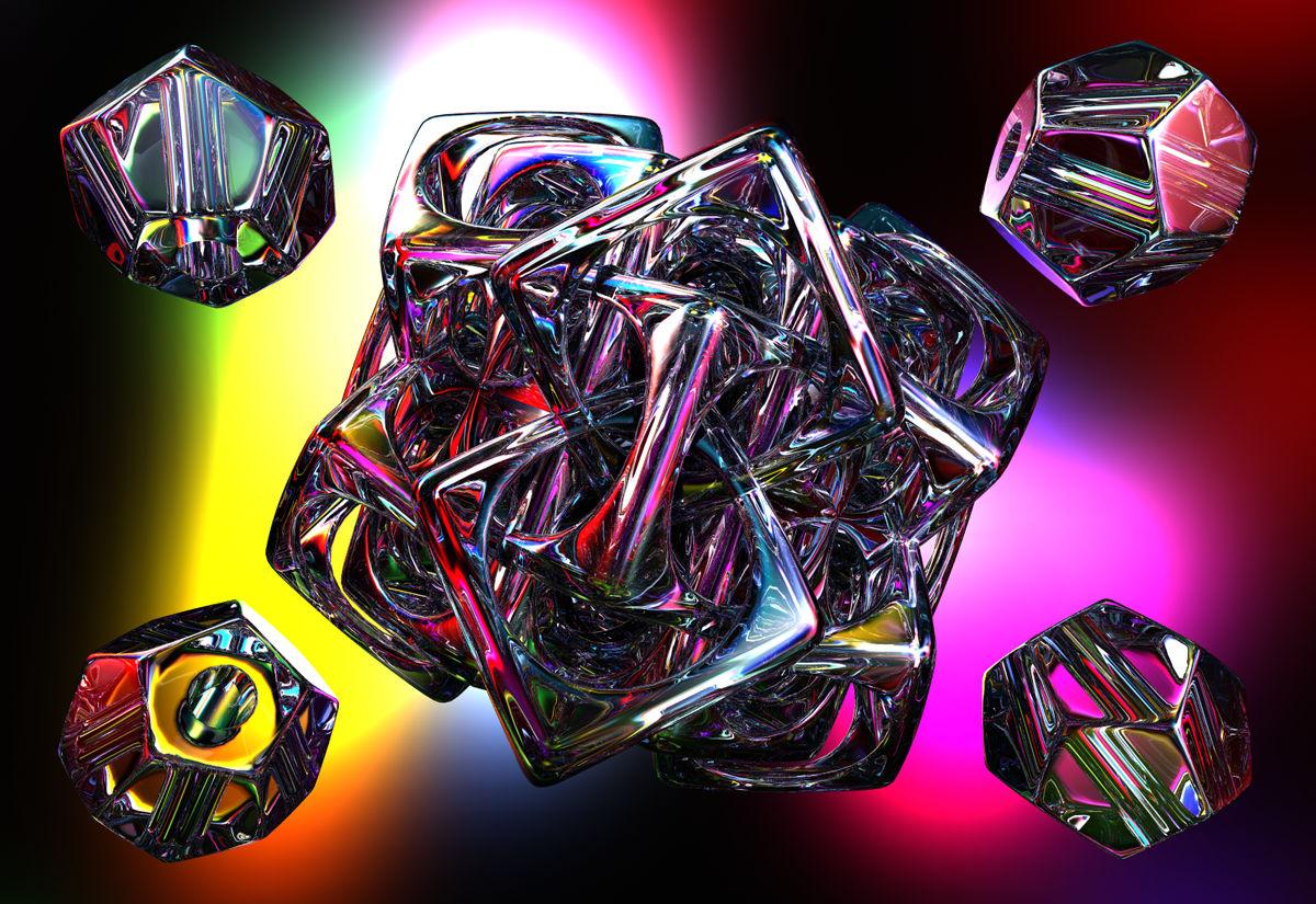 An Experiment with TIR (Total Internal Reflection). All objects are fully transparent with refraction 300. An HDRI from Hyper Textures Base shines as backdrop through the objects, the big one was made in Wings3D, the others are from Gemstones The Cable Stock Set. No HDRI Effect, no sun, no lights. Rendered with Max Ray Depth 12 and TIR 4.