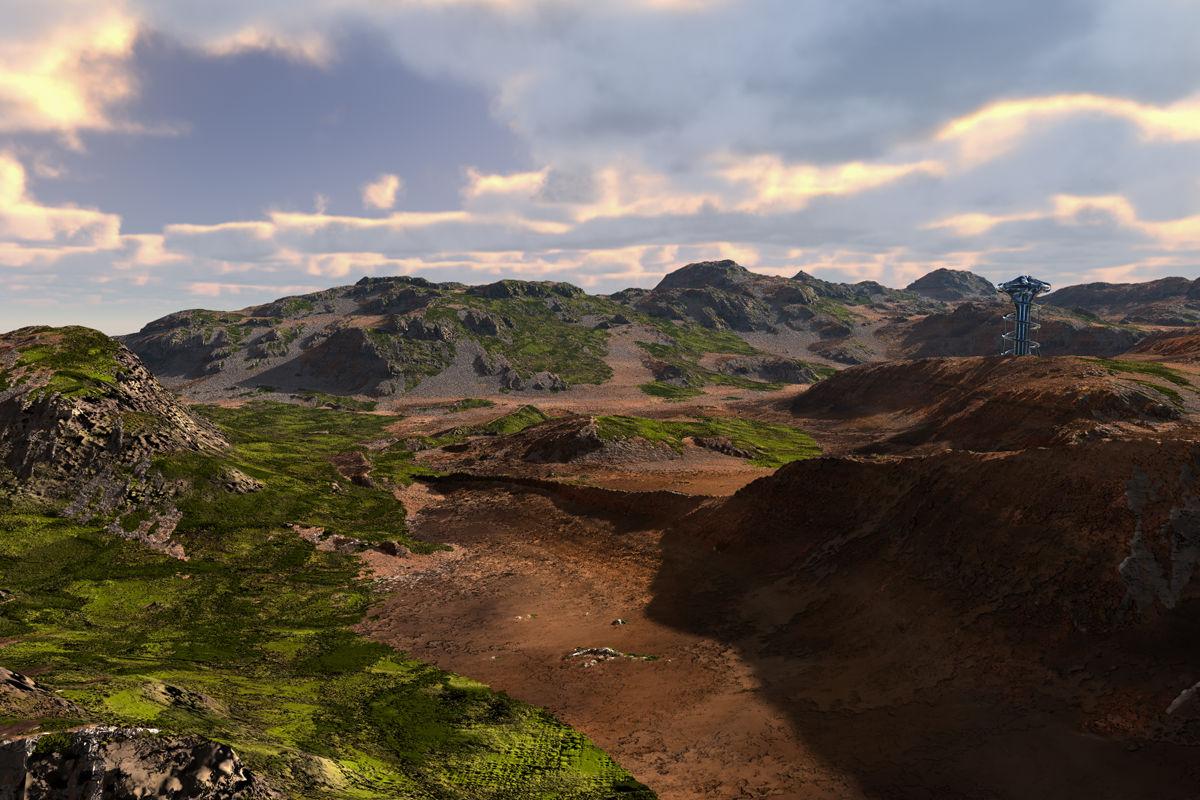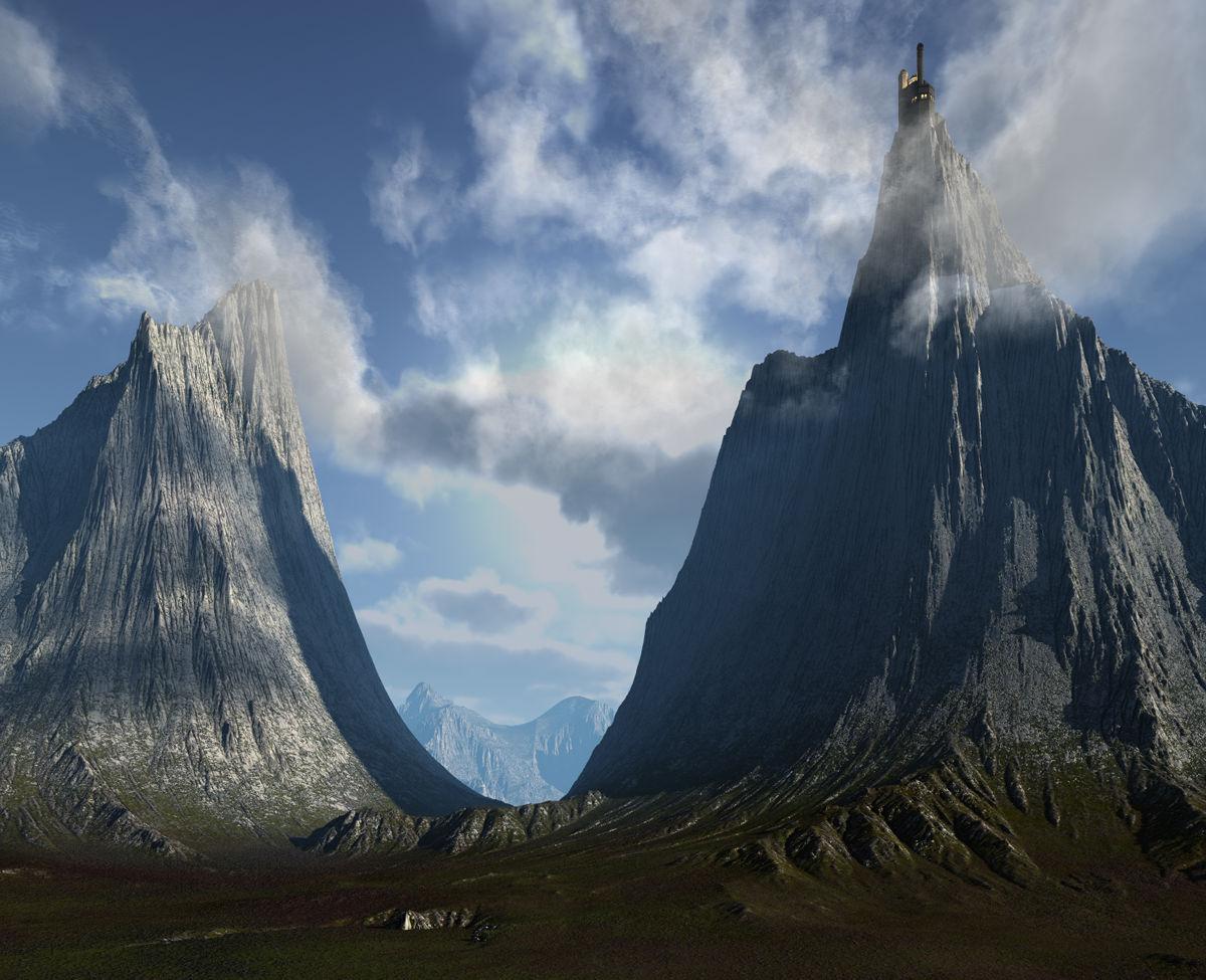 Triple stacked terrain from Grand Mountains with materials from two HRT sets. The tower is by Steven Ray, the material from Fifty Funky Shapes & Fifty Funky Metals. Clouds and the ambient light from the Sky Toolbox.
