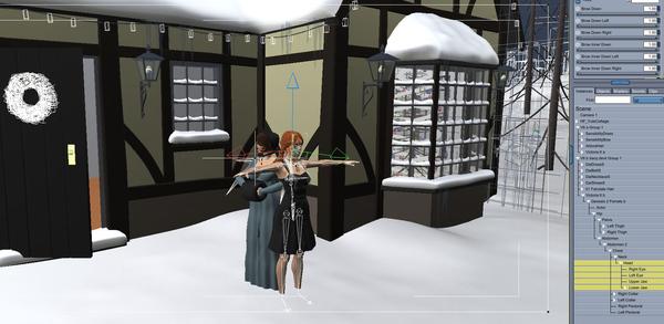 I am putting together a large outdoor winter scene with Howie Farkes Yuletide Cottage, 3 genesis 2 females, and 1 genesis male. I first loaded the Howie Farkes set and no problem. I then loaded the first G2F, changed its name to A and loaded its associated conforming figures. I was able to use the head morphs to create an expression. So far so good.