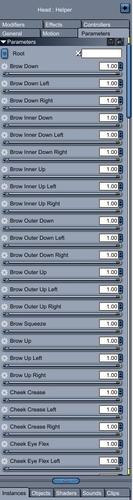 I then loaded the second G2F and renamed it B and loaded its associated conforming figures. However, when I go to the second G2F's head, all of the morphs are already at 1 and are locked there (but do not seem to actually affect the head).