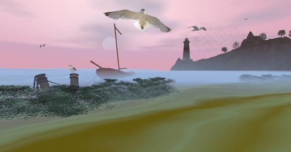 The huge flock around the island off in the distance is carved up with spheres. I'm sure with some adjustments, that could look more natural. However, at that distance, did I need a flock of birds, or would a random pattern of specks be just as good?